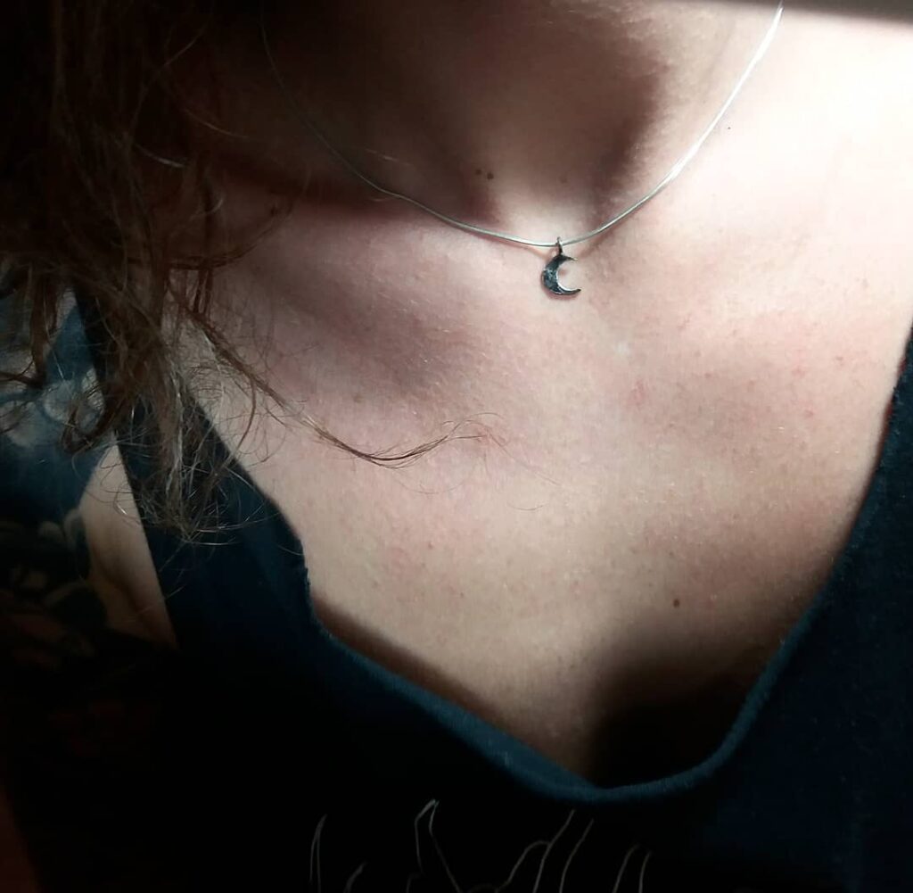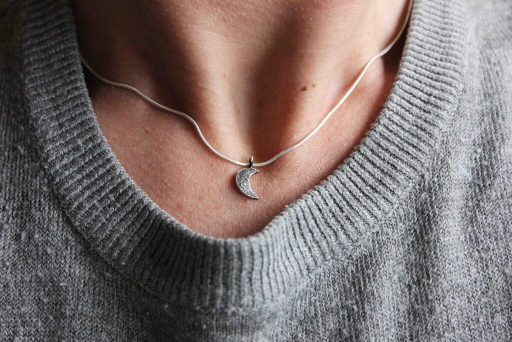 A silver crescent moon necklace hanging from a snake silver chain. A delicate and dainty silver moon necklace with an oxidised finish. Reticulation,…