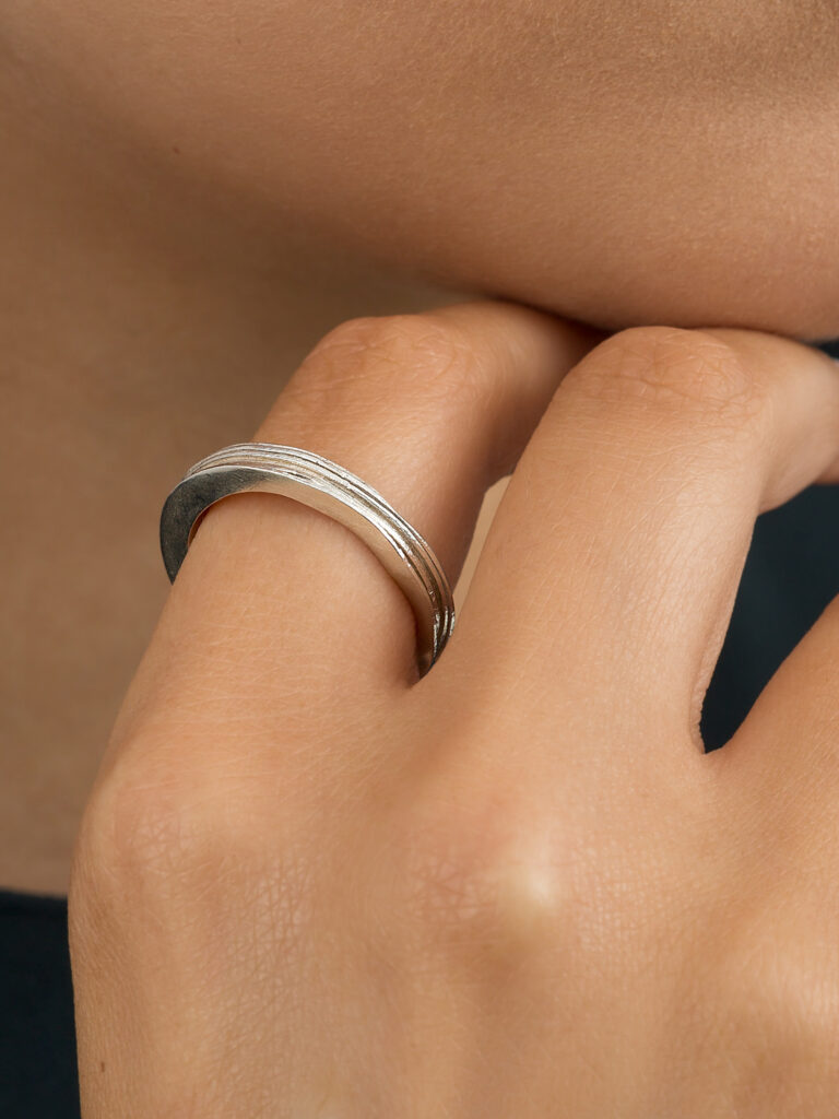 £250.00Made from eco silver sheets soldered together to create this unique texture of layers. This adjustable open band ring is ideal if you…