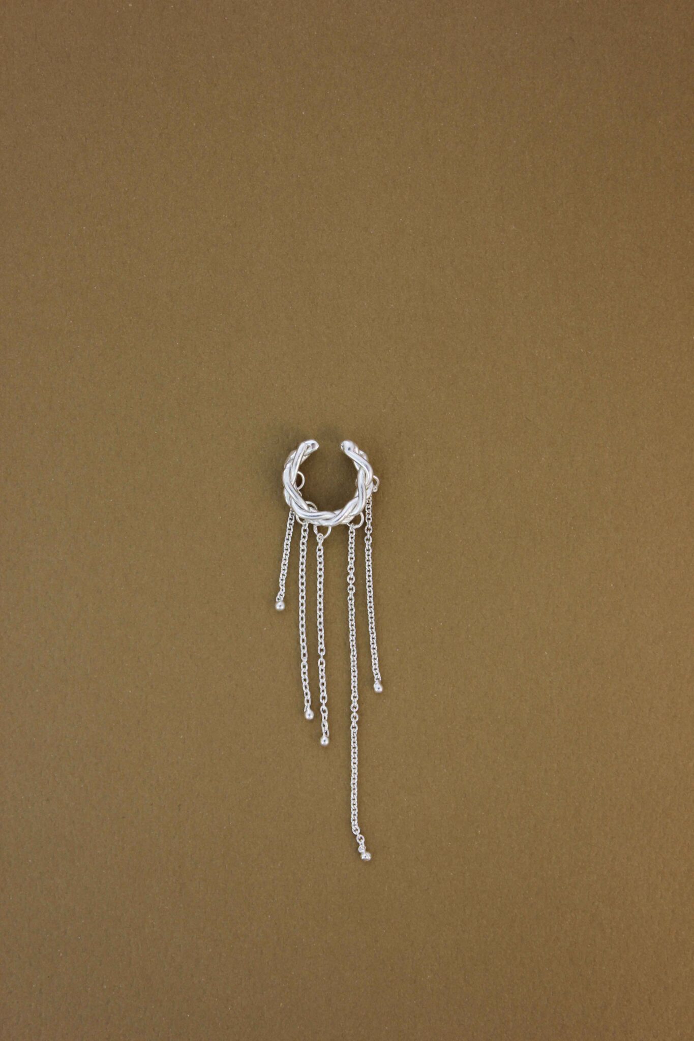 Crafted with an interwoven band and finished with fine chain drops, it creates a layered, dynamic effect that catches the light beautifully. Designed for effortless wear, this cuff slips on securely without a piercing — perfect for adding a touch of drama to your everyday or evening look.