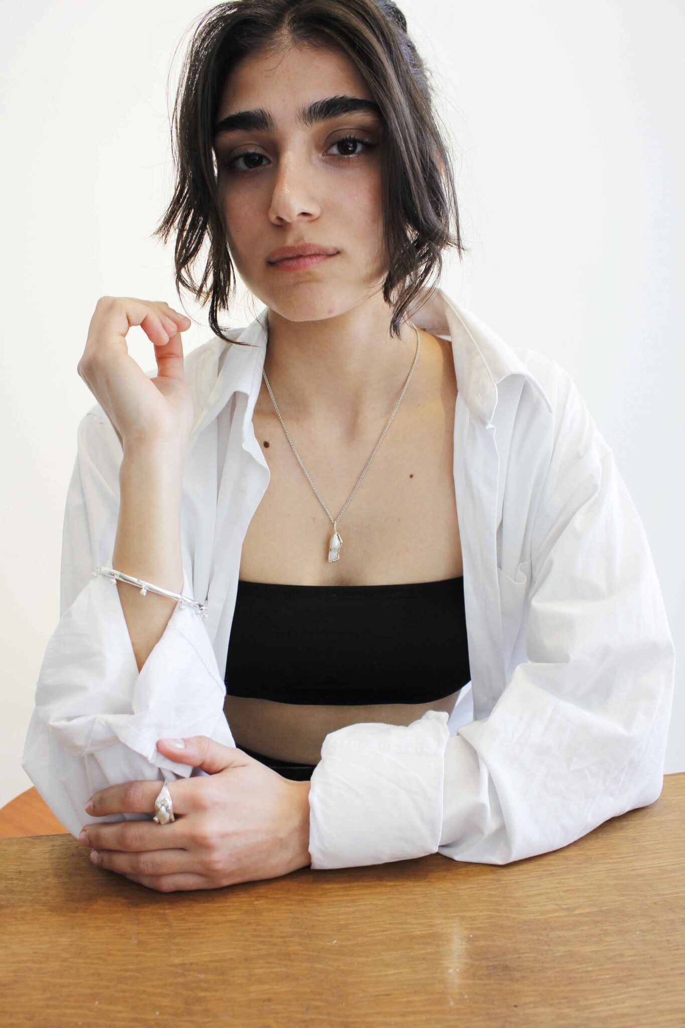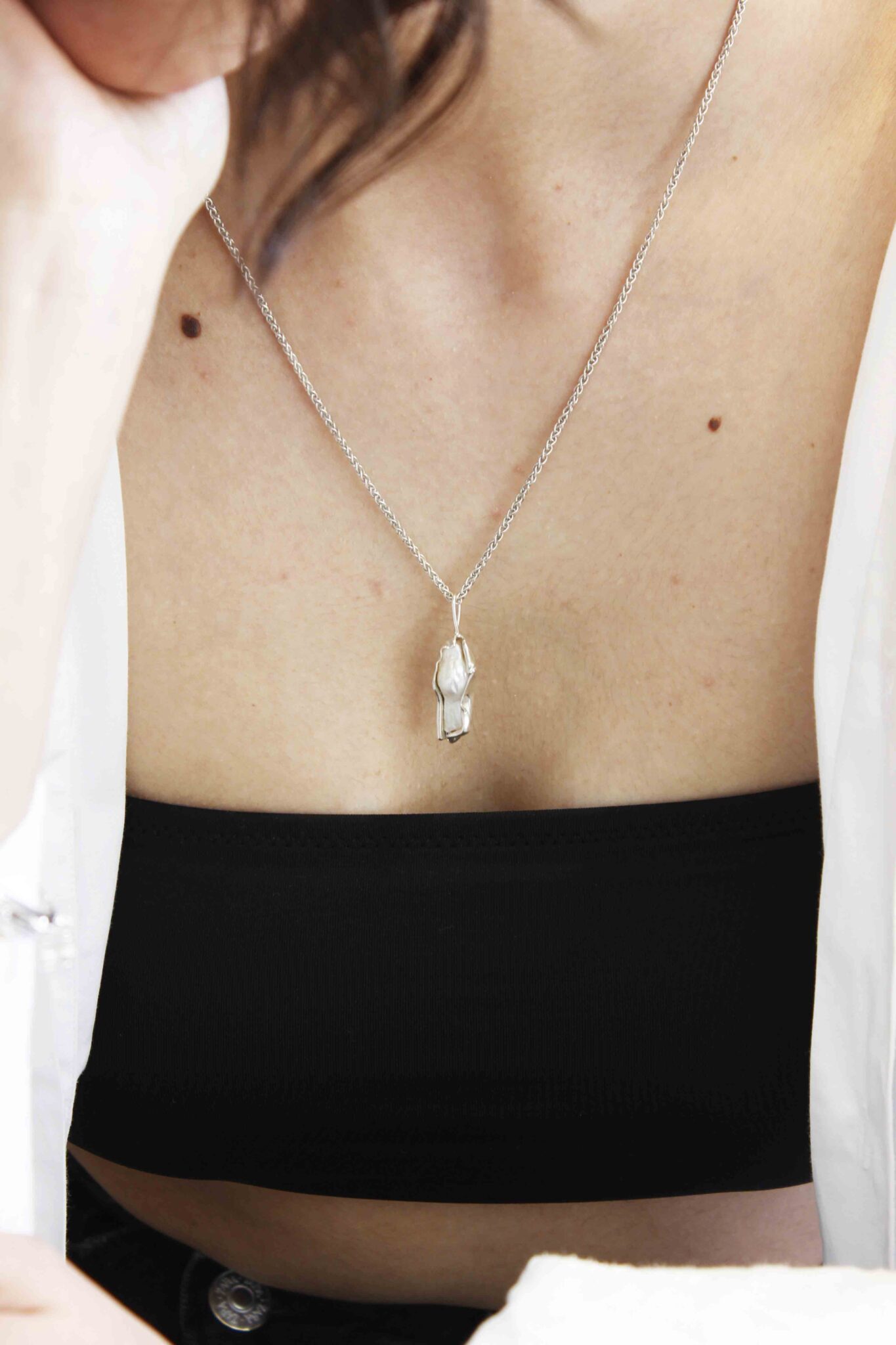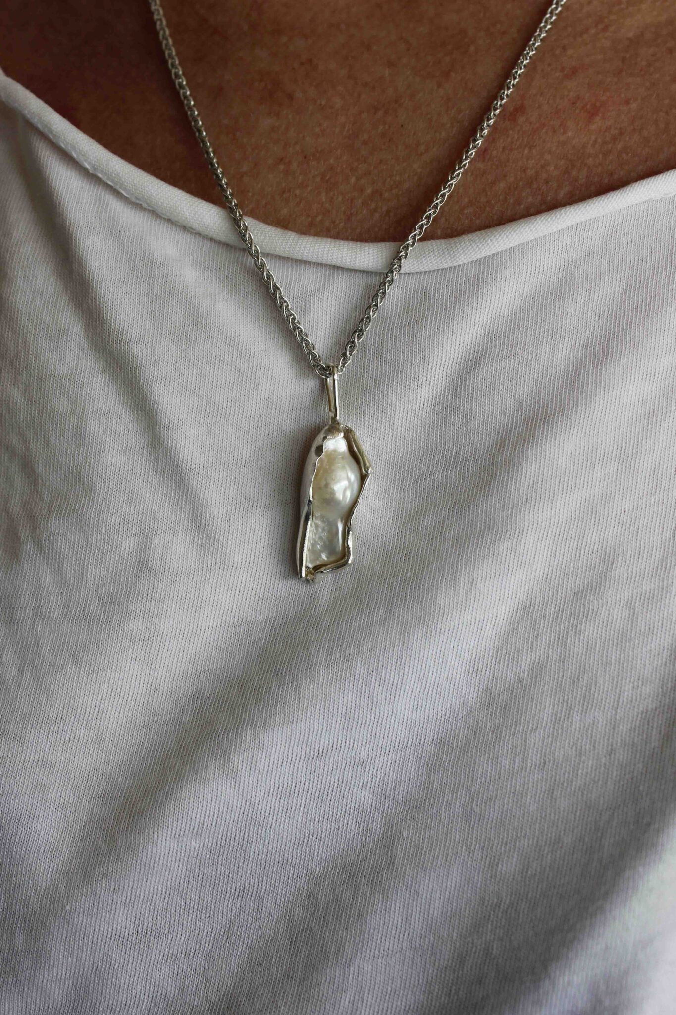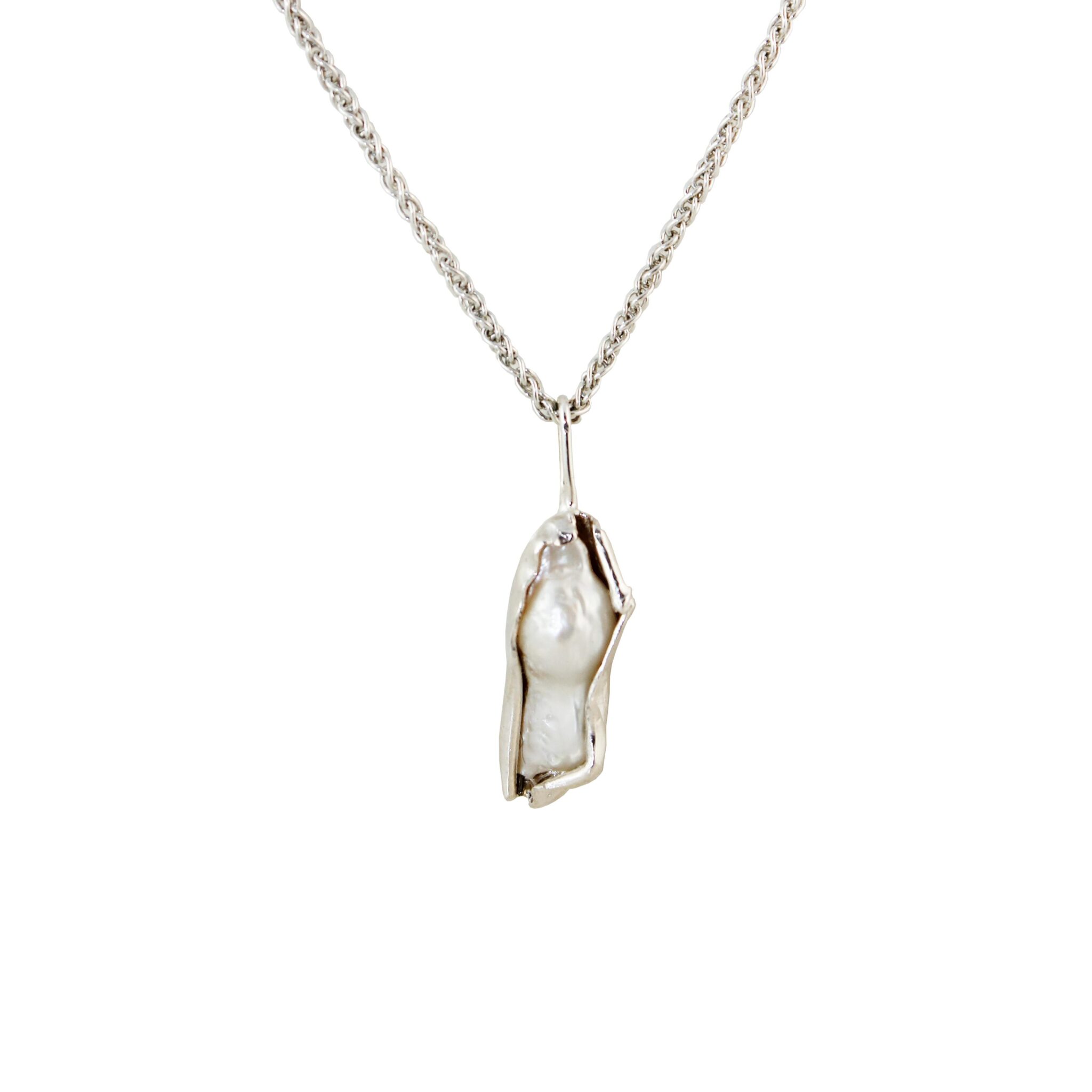 Made from recycled silver. The metal surrounds the fresh water pearls in a unique way, creating folds and organic creases, mimicking the natural form of shells.