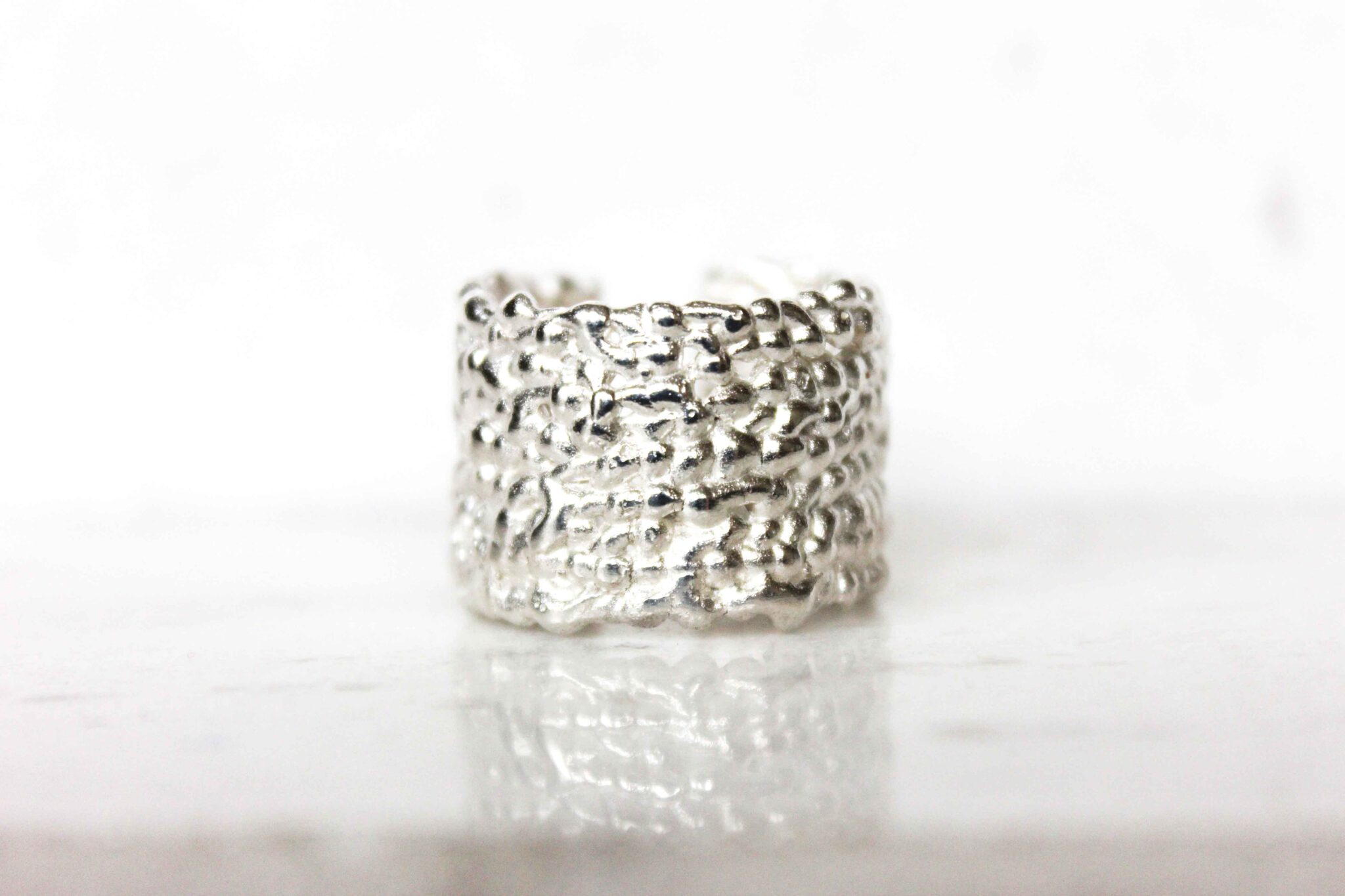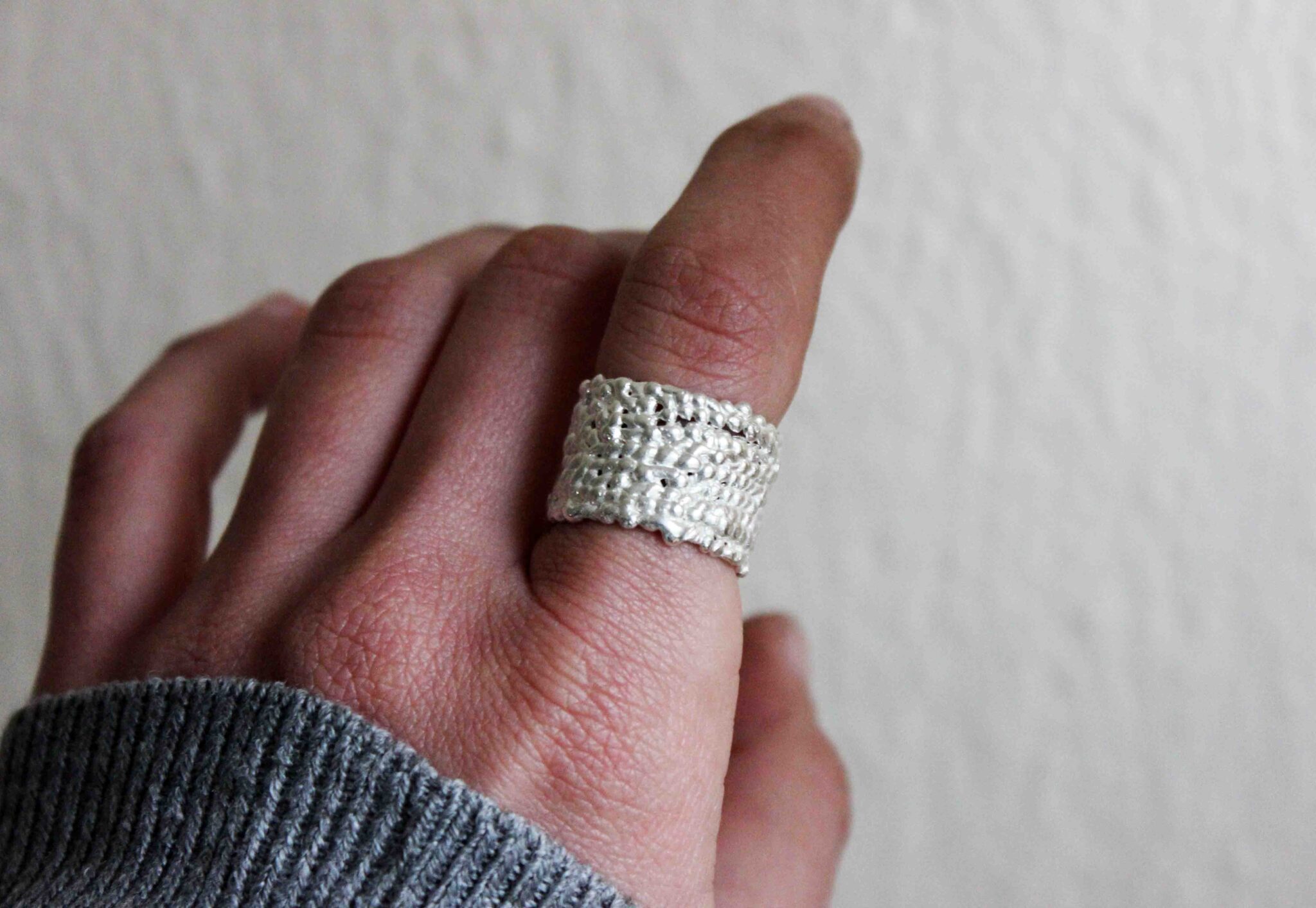 A chunky silver ring with a textured organic feel.