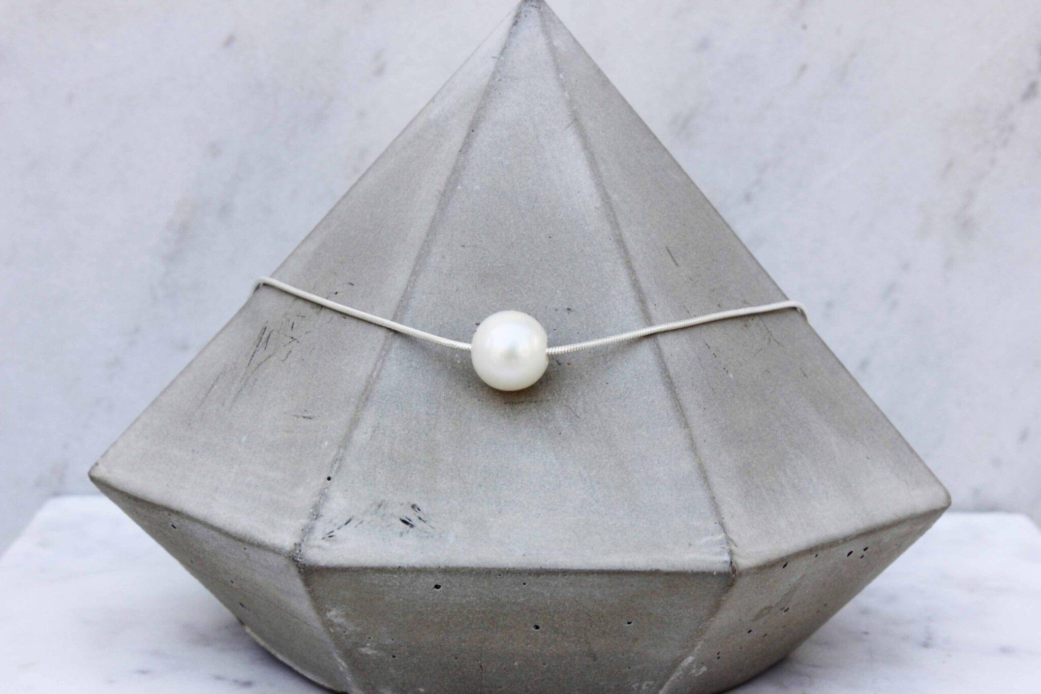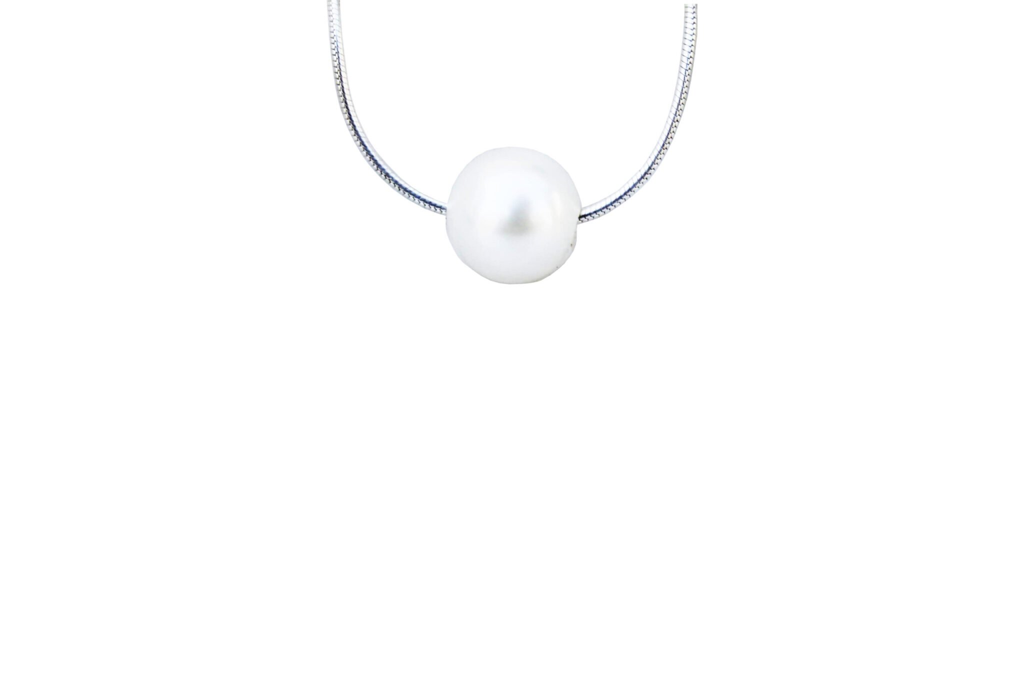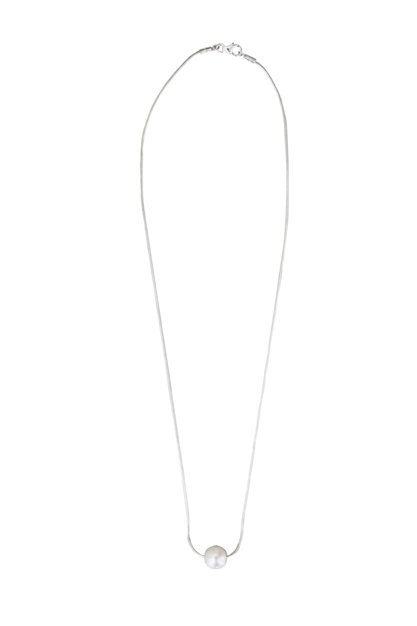 A dainty, everyday pearl necklace, hanging from a sterling silver snake chain.