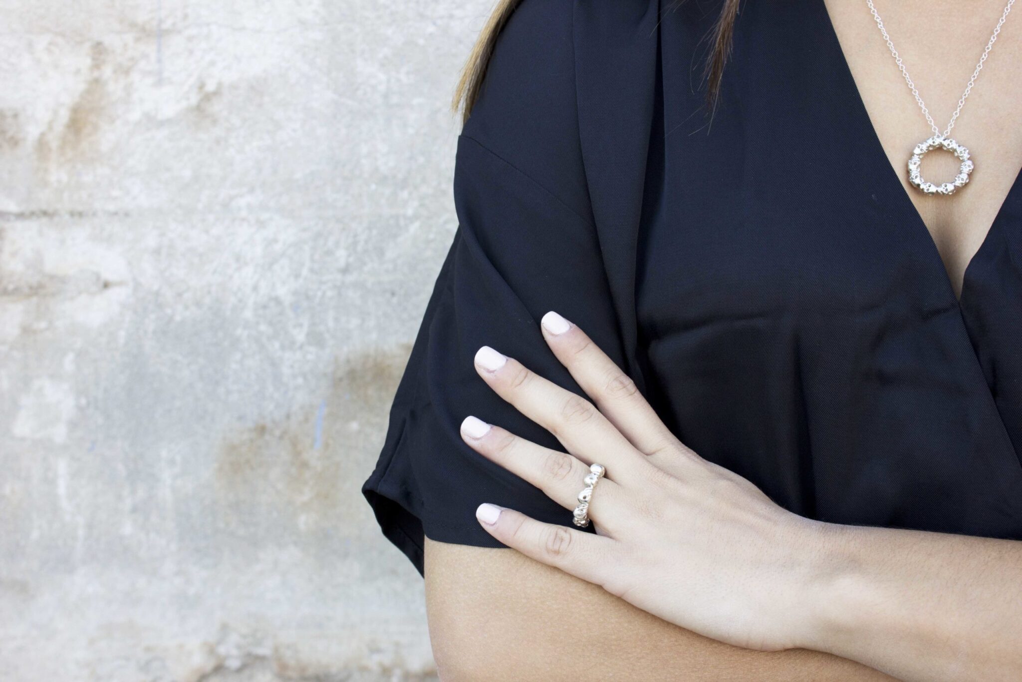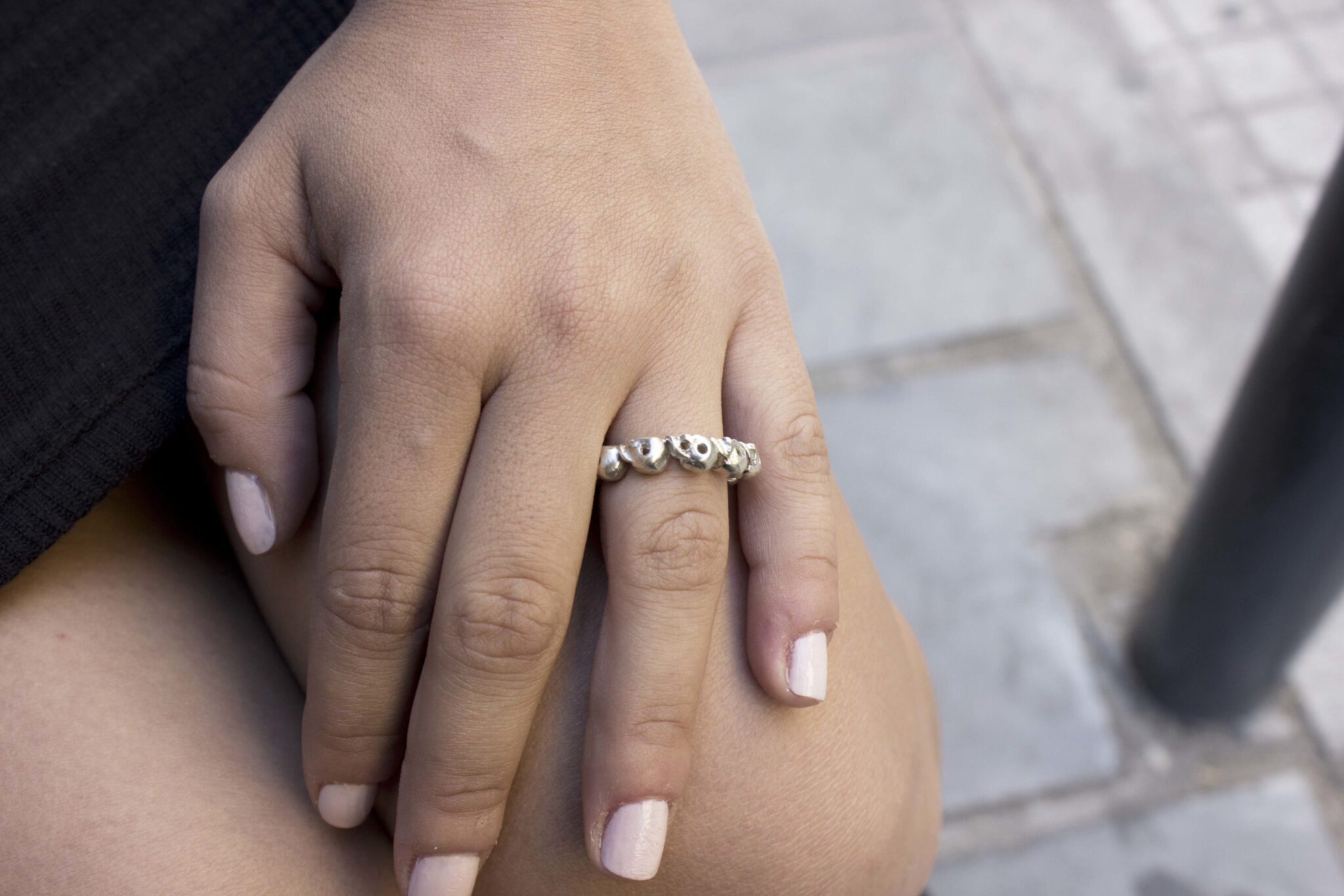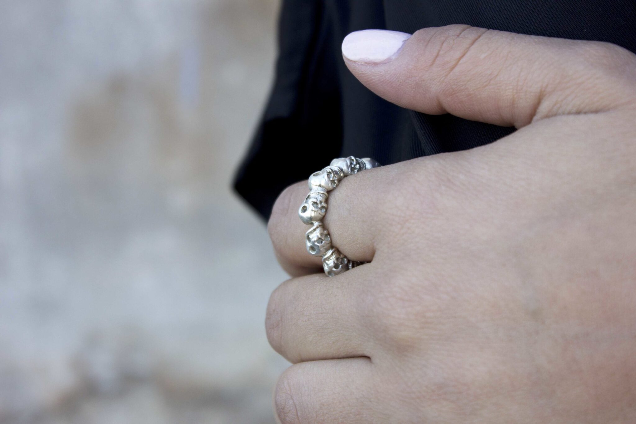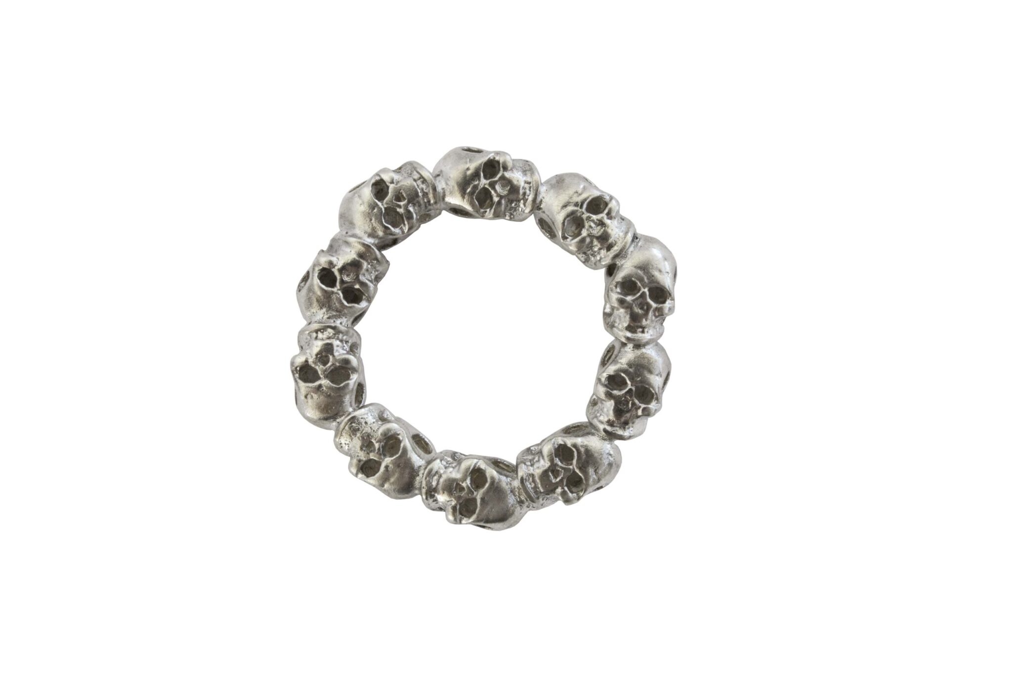 The ring features ten small sterling silver skulls attached one by one, and it is only available in limited sizes.