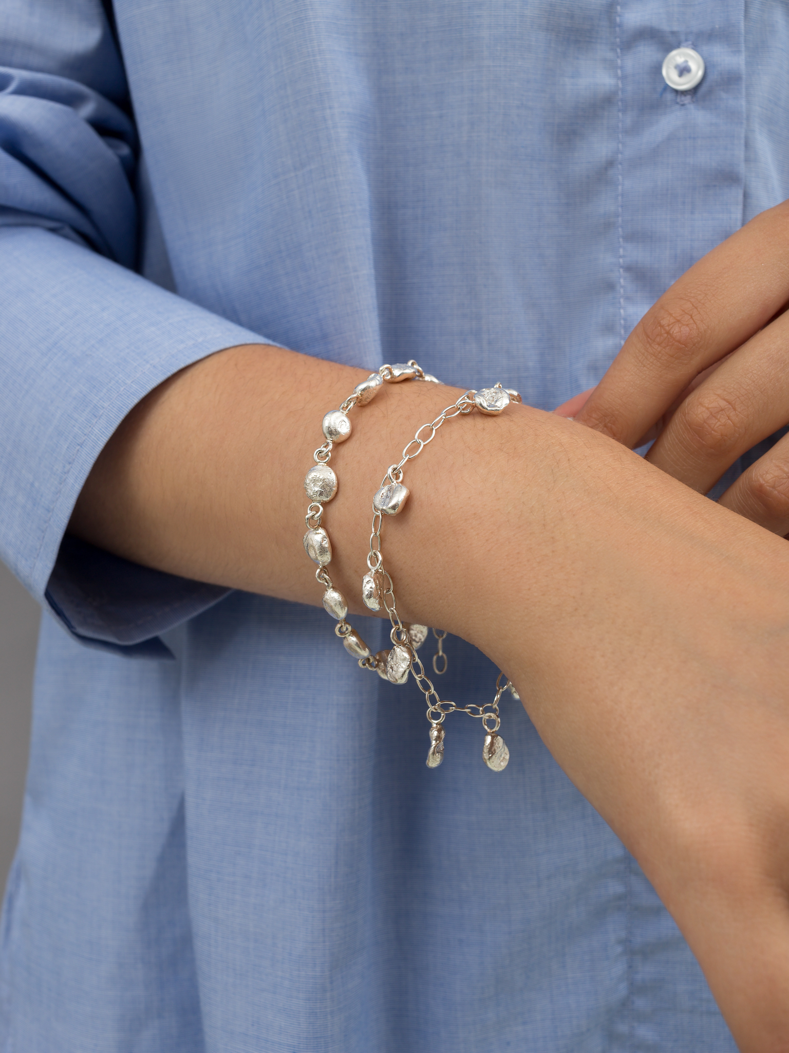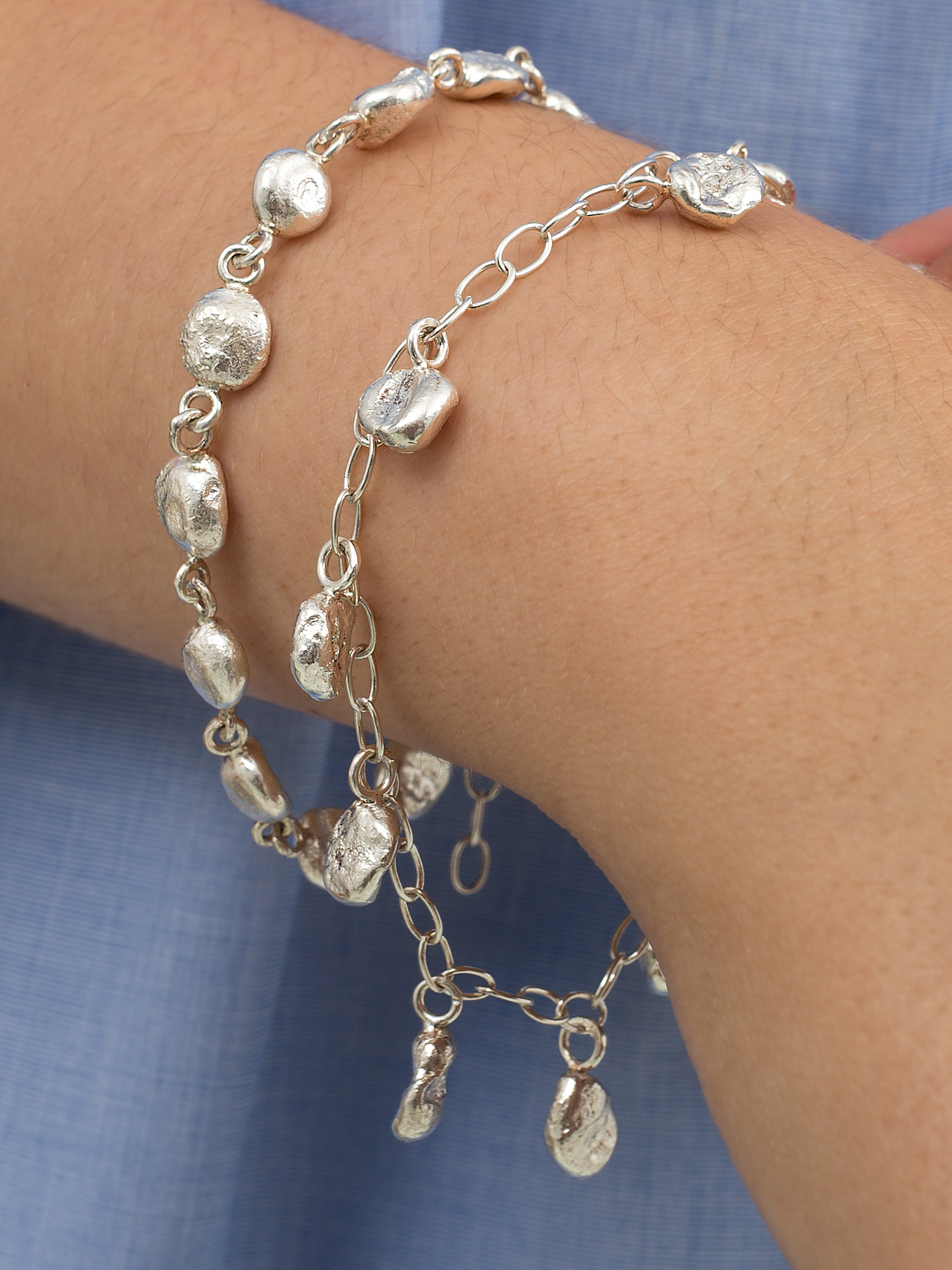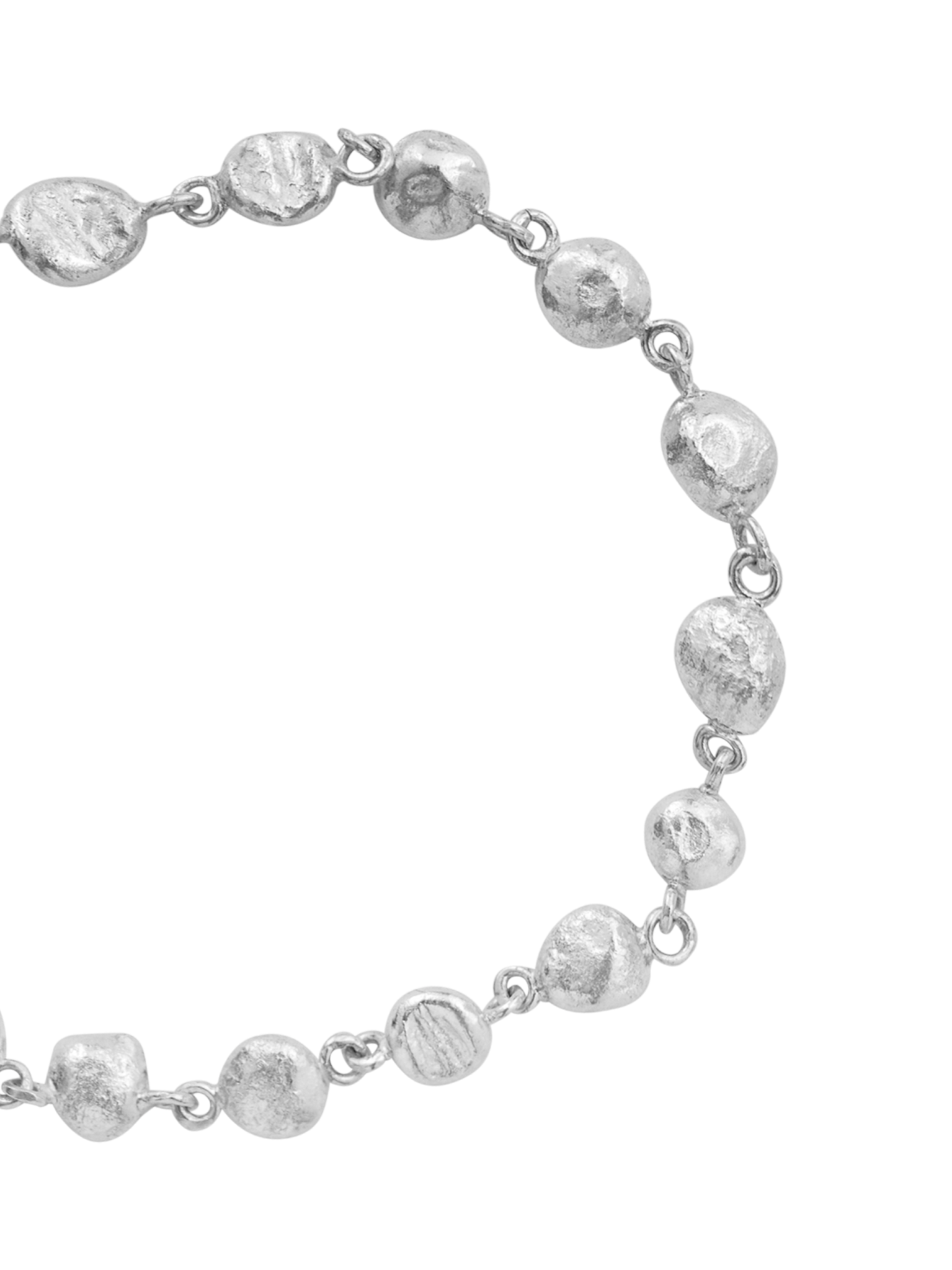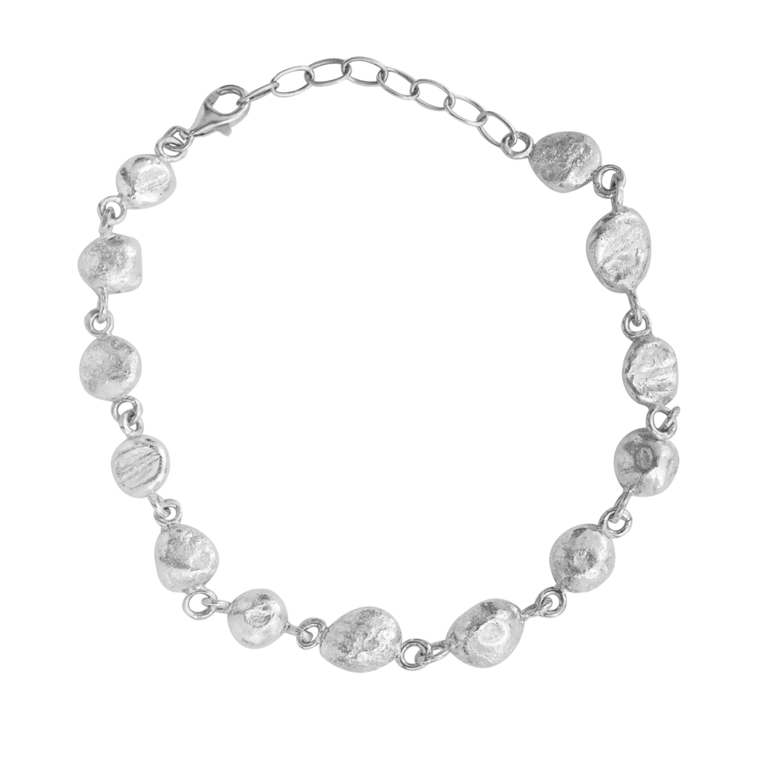 The Gaia Bracelet consists of 13 hand melted silver balls.