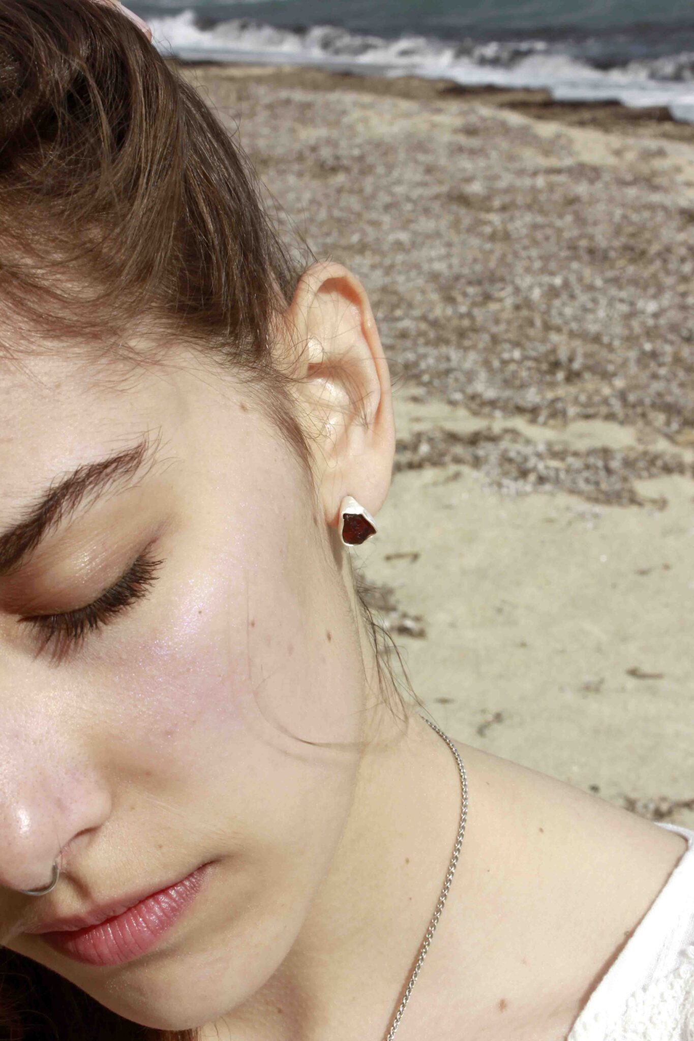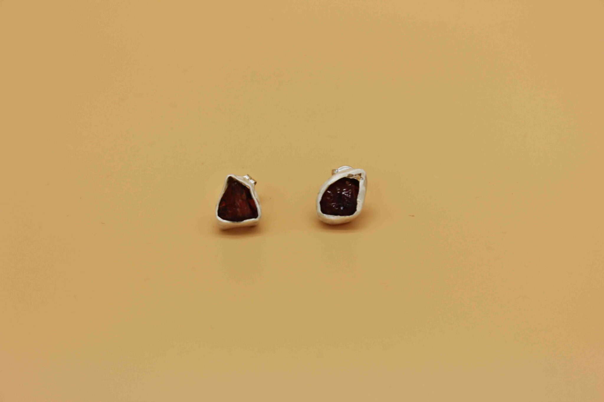 Stud earrings with rough garnet stones. Perfect for your everyday outfits.