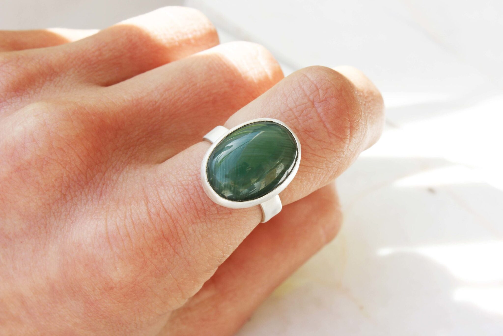 This one of a kind green agate ring is totally handmade and adjustable. Therefore is a perfect choice if you are not sure about the size.