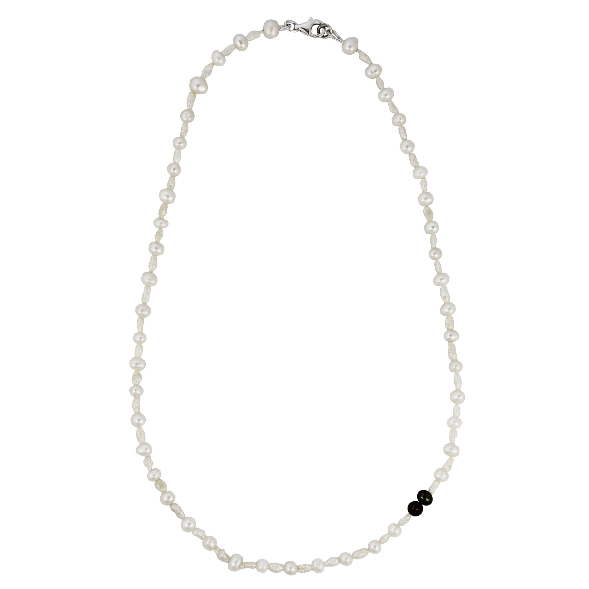 Designed for those who appreciate elegant, natural, and handmade jewellery, this necklace is a must-have addition to any collection. The unique placement of contrasting black beads adds a modern edge to the classic pearl strand, making it ideal for both casual and formal occasions.