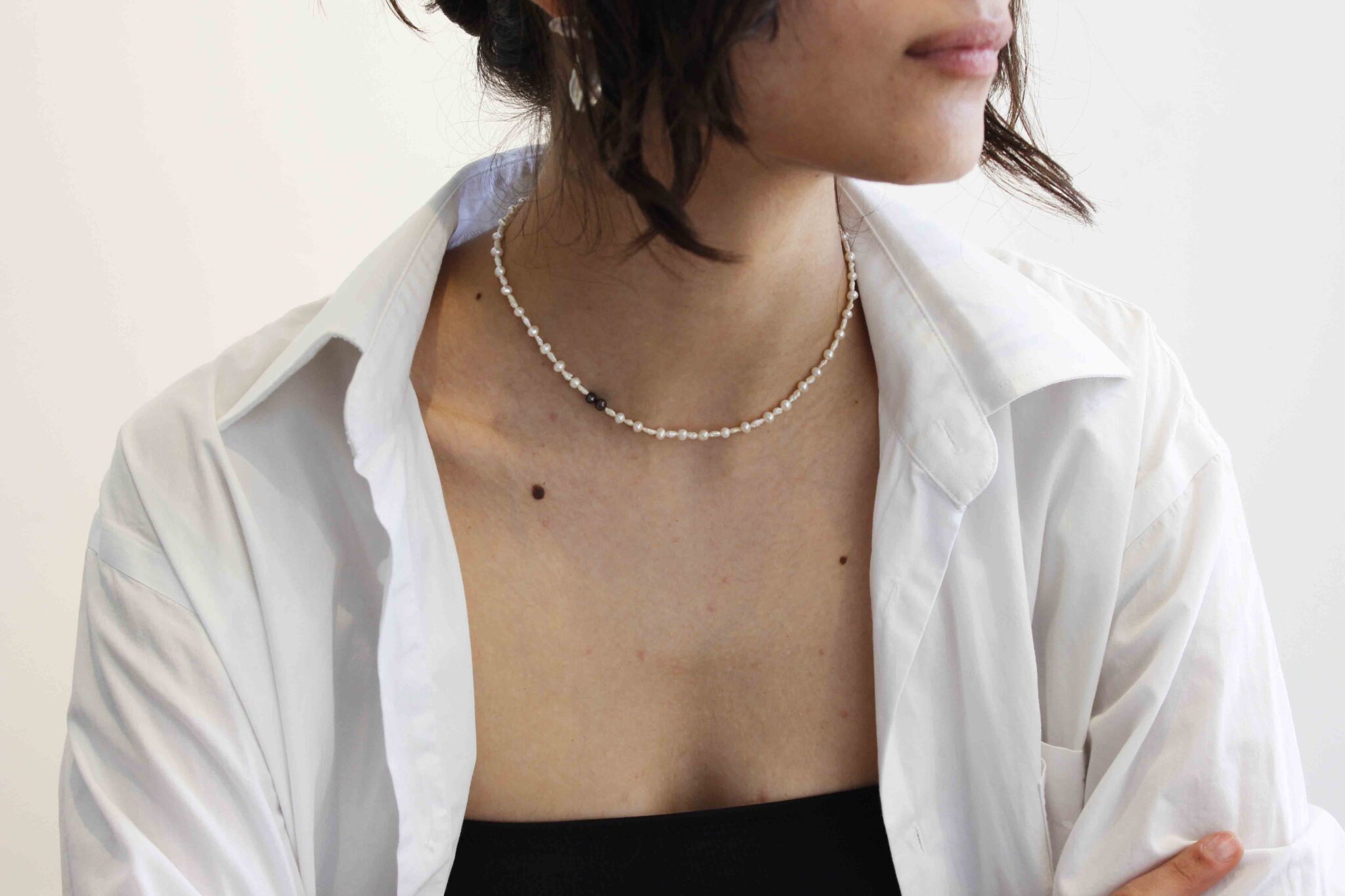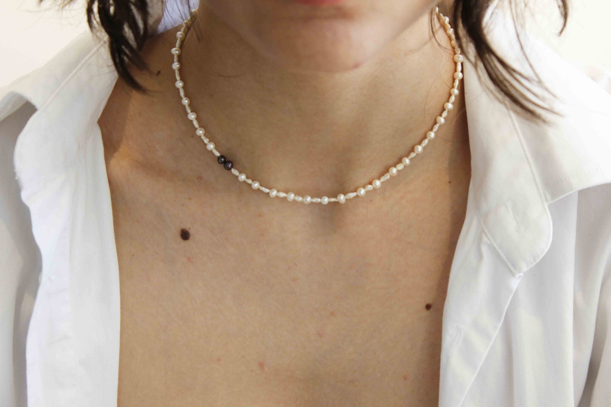This is a delicate yet bold handmade freshwater pearl necklace accented with two black pearls. This timeless piece combines lustrous organic pearls with the deep elegance of black pearls, creating a minimalist yet sophisticated design perfect for layering or wearing solo.