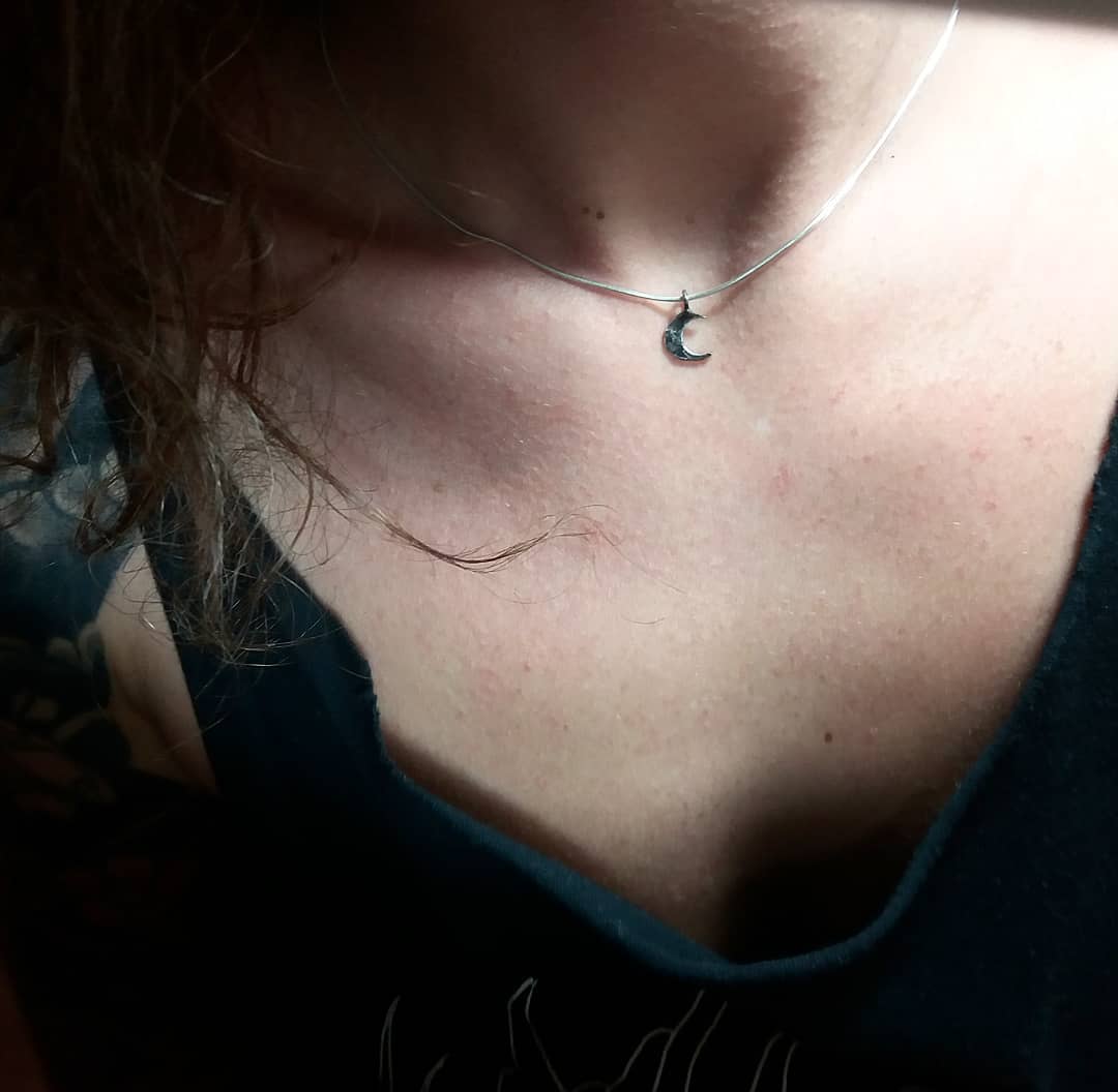 This safety pin charm contains three elements: a sea eye set in sterling silver, a half and a full moon made from burnt sterling silver.