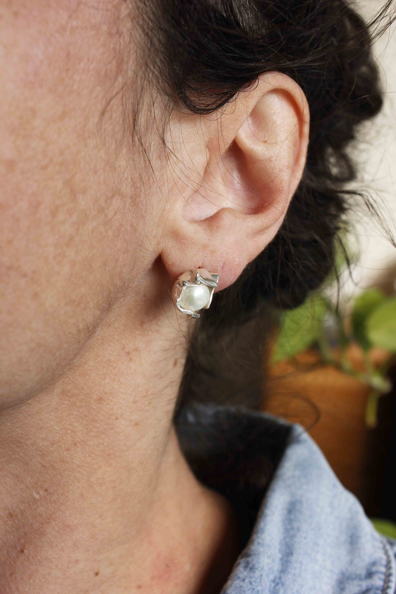 A pair of asymmetric earrings made from recycled silver. The metal surrounds the fresh water pearls in a unique way, creating folds and organic creases, mimicking the natural form of shells.