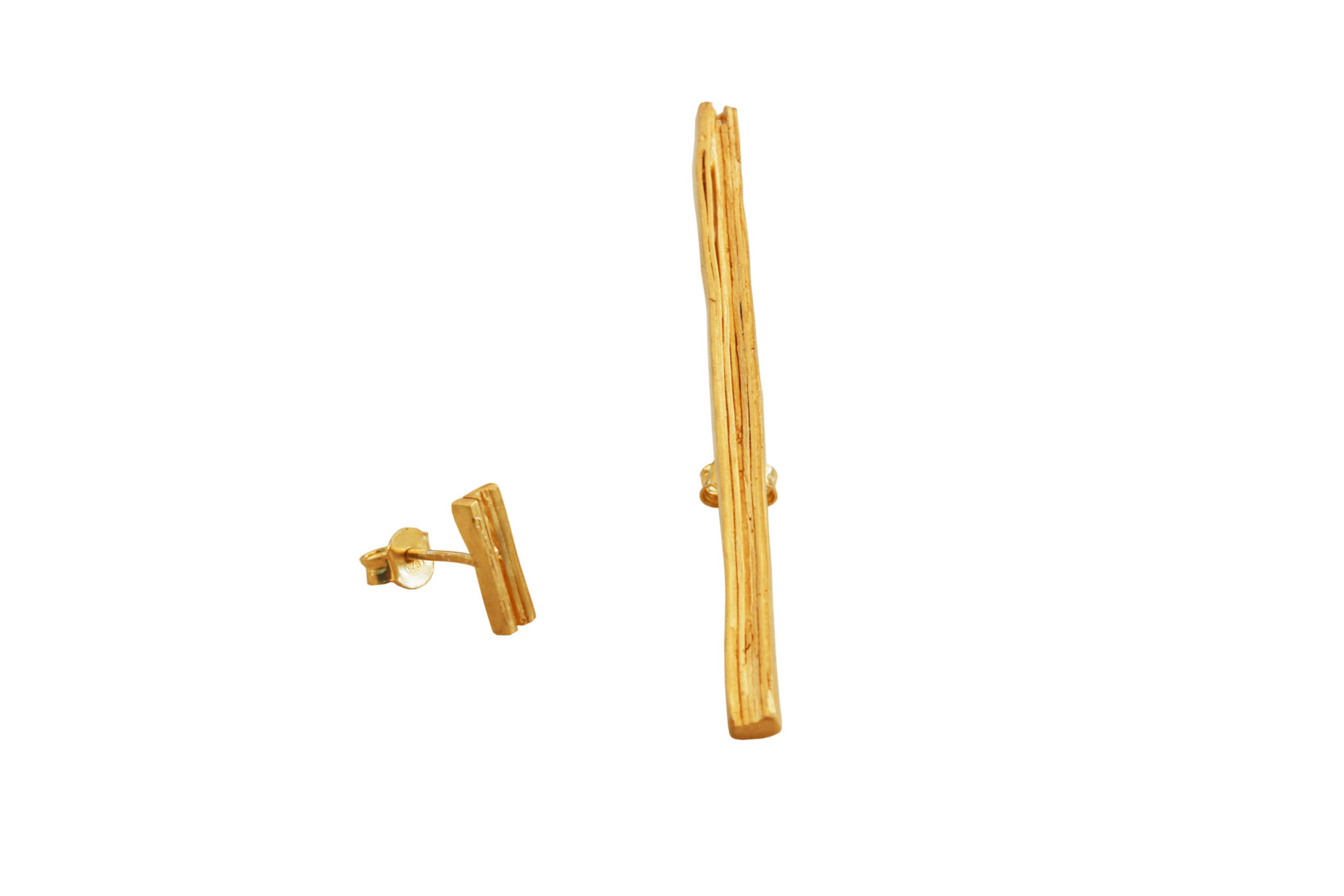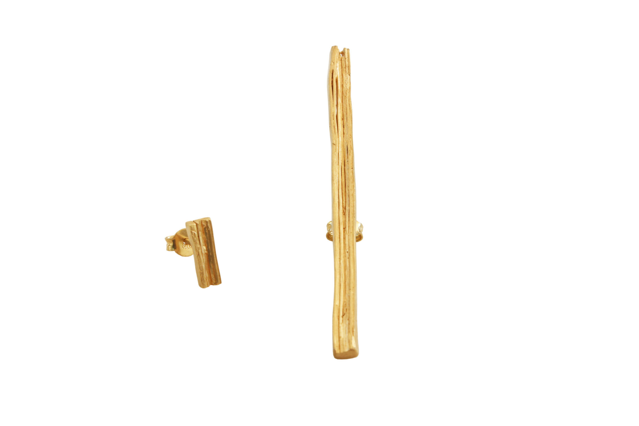 A long earring comes in pair with a stud to create a unique and unusual style.