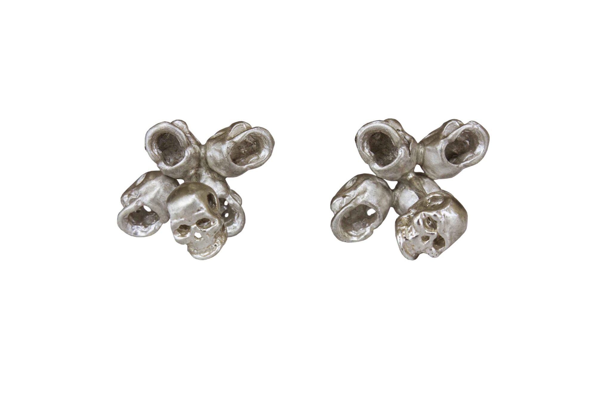 The earrings are made of four small silver skulls soldered together, finished off with a post and a skull screw finding.